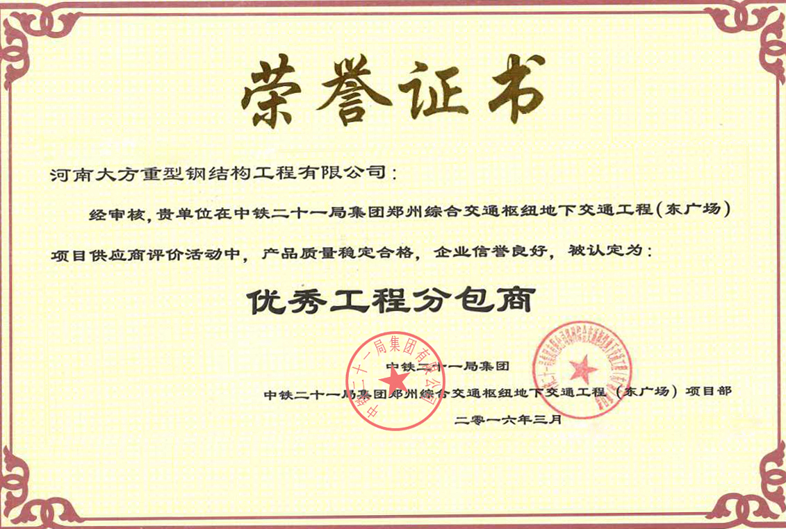 近日,從中鐵二十一局傳來喜訊,在鄭州綜合交通樞紐地下交通工程(東廣場)項(xiàng)目分包商評估活動(dòng)中,河南大方重型鋼結(jié)構(gòu)工程有限公司因產(chǎn)品質(zhì)量穩(wěn)定合格、交付及時(shí),企業(yè)信譽(yù)良好,提供優(yōu)質(zhì)服務(wù)被認(rèn)定為“優(yōu)秀工程分包商”。此項(xiàng)榮譽(yù)的獲得肯定了大方鋼構(gòu)在鄭州綜合交通樞紐地下交通工程(東廣場)項(xiàng)目中做出的積極貢獻(xiàn),也充分證明了中鐵二十一局集團(tuán)對大方鋼構(gòu)公司的信任。