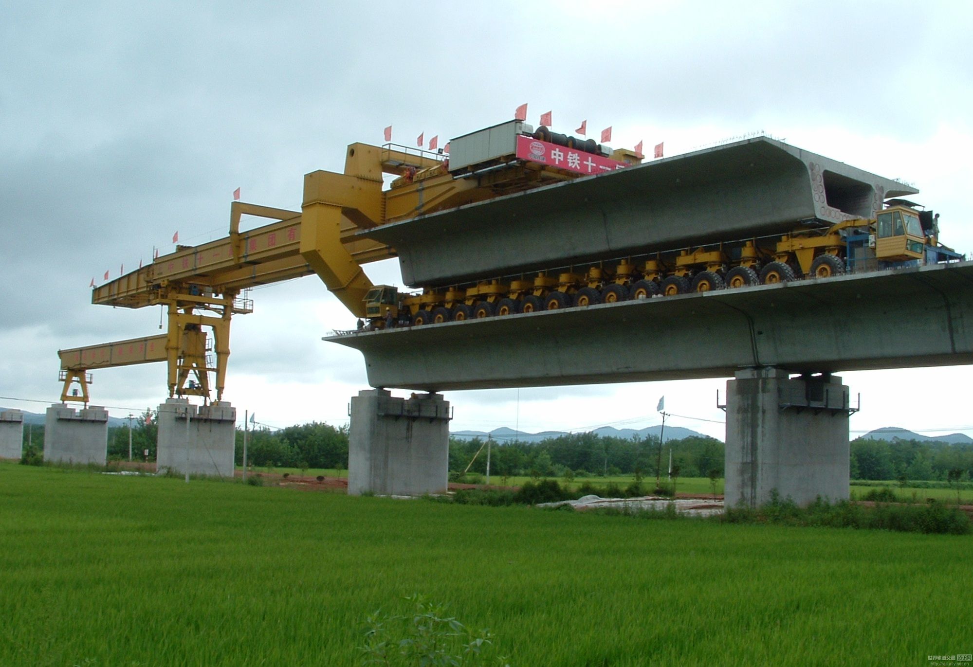 JQ900A型架橋機架梁作業(yè)為跨一孔簡支式架梁,由YL900型運梁車運梁至架橋機尾部喂梁,起重小車吊梁拖拉取梁,空中微調(diào)箱梁位置就位,架橋機采用液壓驅(qū)動輪胎走行,步履縱移過孔作業(yè)方式??梢约茉O(shè)32m、24m、20m雙線整孔箱梁,適應(yīng)架設(shè)曲線半徑R5500m,適應(yīng)架設(shè)縱坡20‰,額定起重量900t。