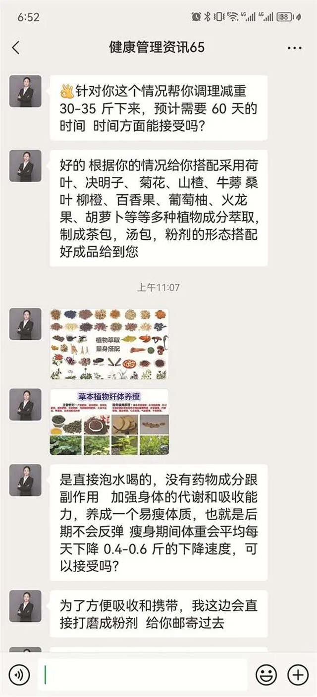 為了解具體的情況,記者通過掃碼添加了客服微信號(hào)“健康管理資訊65”??头仁窃敿?xì)詢問了年齡、身高、體重、日常生活習(xí)慣等個(gè)人情況,然后根據(jù)個(gè)人情況評(píng)估,稱可以幫忙調(diào)理減重30-35斤,預(yù)計(jì)需要約60天,并提供了860元和980元的兩個(gè)瘦身方案可供選擇。其間,客服還給記者發(fā)了多張“顧客”減肥成功的照片,通過前后對(duì)比證明“減肥藥”的效果。