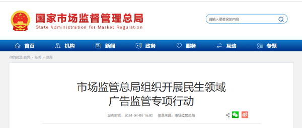 4月9日,國家市場監(jiān)督管理總局發(fā)布消息,自2024年4月至11月在全國范圍內(nèi)組織開展民生領(lǐng)域廣告監(jiān)管專項(xiàng)行動(dòng)。