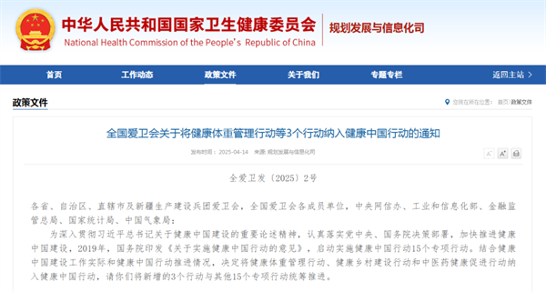 核心內容:將健康體重管理行動納入健康中國行動,強調體重水平與人體健康狀況密切相關,體重異常是慢性病的重要危險因素,要將其作為專項行動積極推動和倡導。